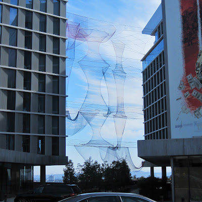 The Jeremy Hotel in West Hollywood on Sunset Blvd. at La Cienega is joined by a web-like, netting art installation by Janet Echelman titled "Dream Weaver." At night the 10-story fiber structure is lit by multicolored LED lights.